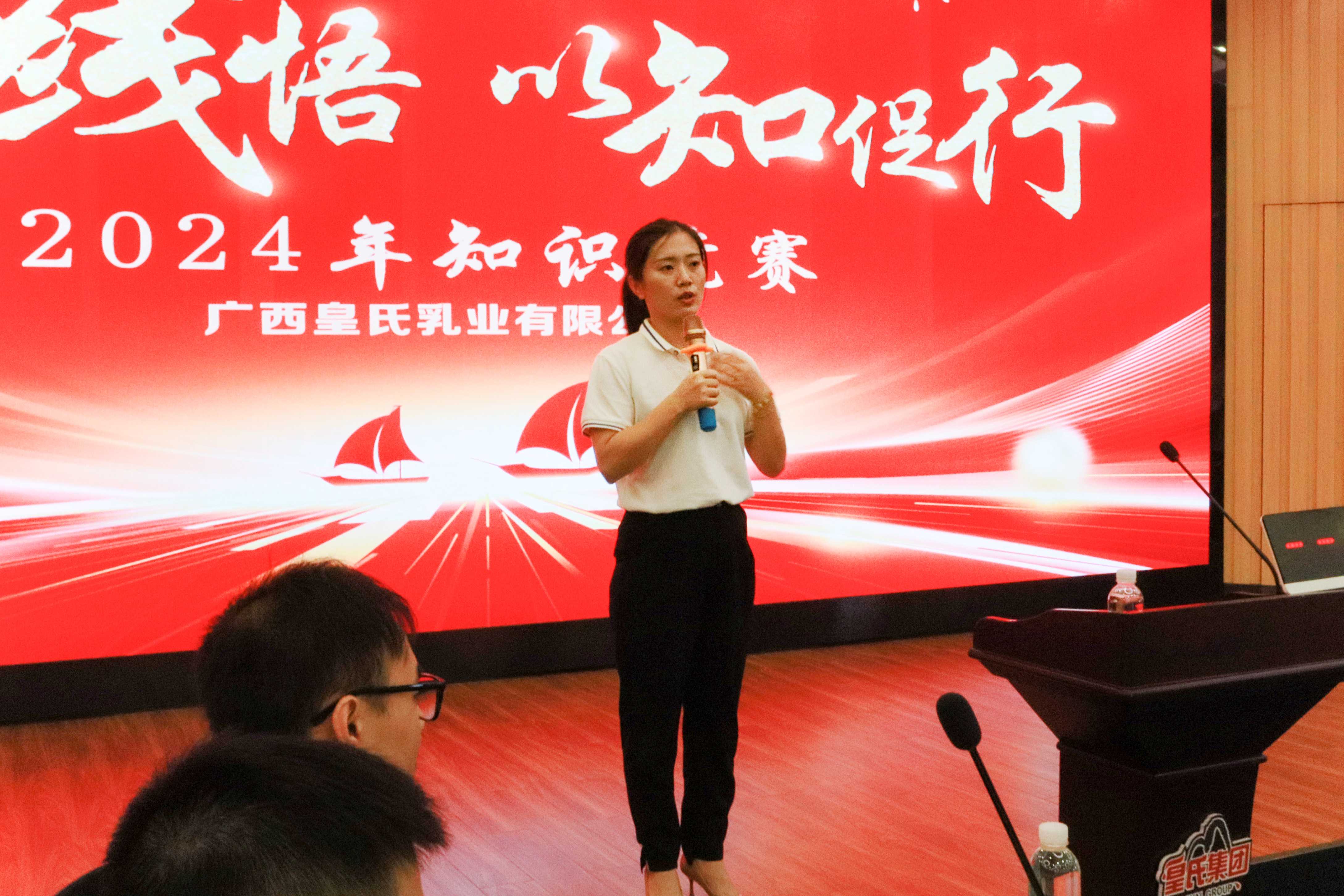 为进一步提升企业凝聚力、向心力和战斗力,增强公司员工对企业文化的认同感和归属感,以赛促学,打造争先创优、团结和谐、积极进取的良好环境,2024年7月25日,广西皇氏乳业在集团五楼多功能厅组织举办了2024年知识竞赛活动,活动邀请到了广西皇氏乳业有限公司总经理黄俊翔、生产总监王大兴、人力行政副总监唐艳玲等领导出席。
