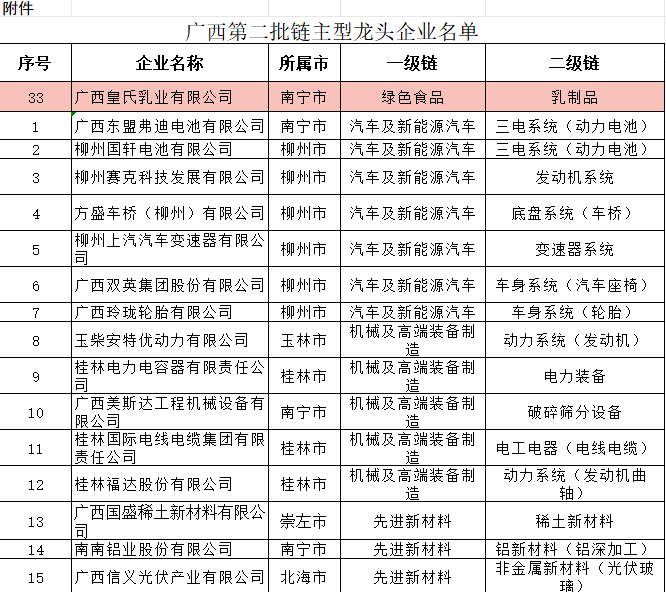 日前,自治区工业和信息化厅、自治区财政厅印发《自治区工业和信息化厅、自治区财政厅关于公布广西第二批链主型龙头企业的通知》(桂工信综合〔2024〕581号),公布了广西第二批链主型龙头企业名单,广西皇氏乳业有限公司光荣上榜。