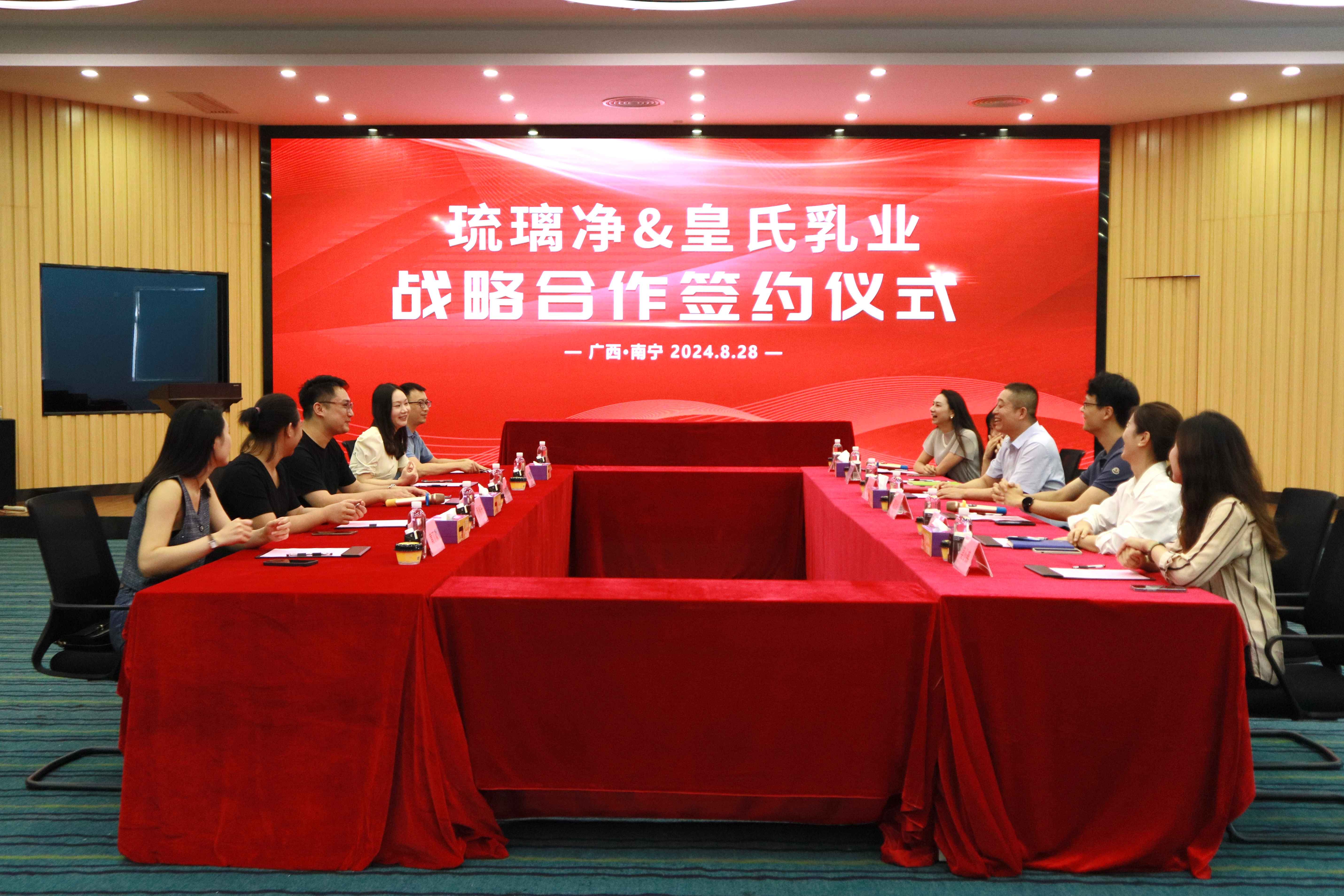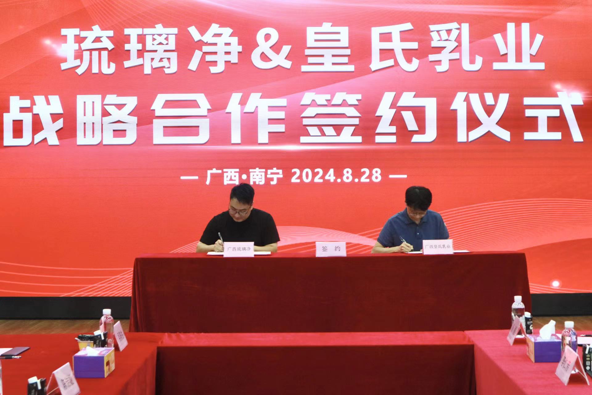 8月28日,广西皇氏乳业有限公司(以下简称:“皇氏乳业”)与广西琉璃净餐饮管理有限公司(以下简称:“琉璃净”)在皇氏集团五楼多功能厅举办战略合作协议签署仪式。皇氏集团董事、乳业集团常务副总经理、广西皇氏乳业有限公司总经理黄俊翔;广西琉璃净餐饮管理有限公司董事长兼总经理陈新辉出席仪式并致辞。