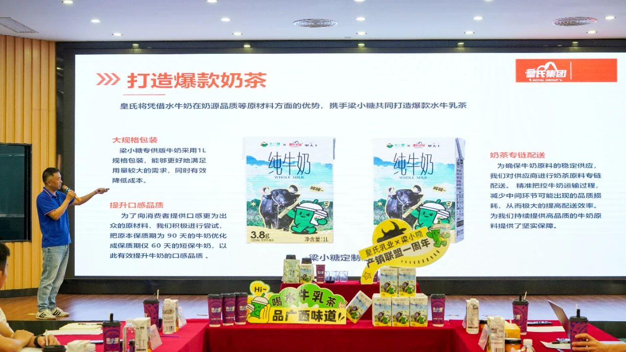 会上,双方共同回顾战略合作一周年的重要时刻。过去的一年里,皇氏乳业与梁小糖携手前行,为消费者带来优质的水牛乳茶系列产品。